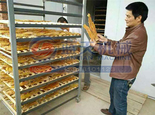 把處理過(guò)的竹筍均勻有序的擺放在不銹鋼托盤(pán)上,把推車推入烘干房?jī)?nèi),在烘干的過(guò)程中,溫度控制在45-60度,烘干時(shí)間為48個(gè)小時(shí),直至竹筍呈金黃色就表示烘干完成,鮮筍的水份含量較大,通過(guò)壓制在烘干,時(shí)間會(huì)縮短不少。